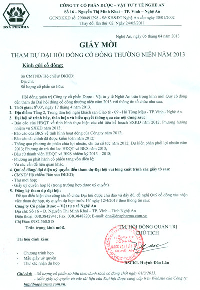 DNA PHARMA Thông báo đại hội đồng cổ đông thường niên năm 201315:12 - 24/08/2022Quan hệ cổ đông, Tin tức DNA, Tải xuống dhcd dnapharma 2013.rarChia sẻ: